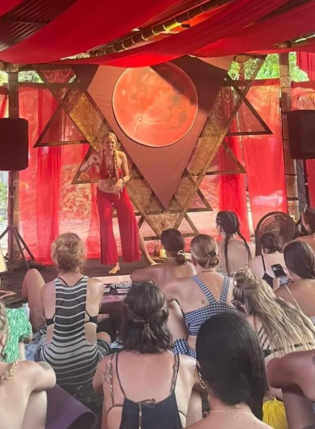 Image 2: Lexi, in a red bralette top and cotton pants, stands in a red tent with a large full red moon and drapes of red behind them , speaking in front of a large group of women in the tent giving a workshop on menstrual cycles.